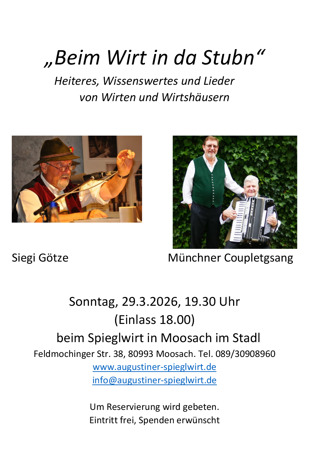 Beim Wirt in da Stubn Heiteres, Wissenswertes und Lieder von Wirten und Wirtshäusern Wir bitten um rechtzeitige Reservierung unter: Reservierung oder Telefon: +498930908960
